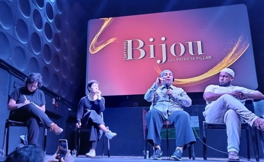 Interpretação consecutiva de debate com o professor Deivison Faustino e a psicanalista Miriam Debieux após a exibição do documentário Por Trás dos Fronts: Resistências e Resiliências na Palestina no Cine Bijou